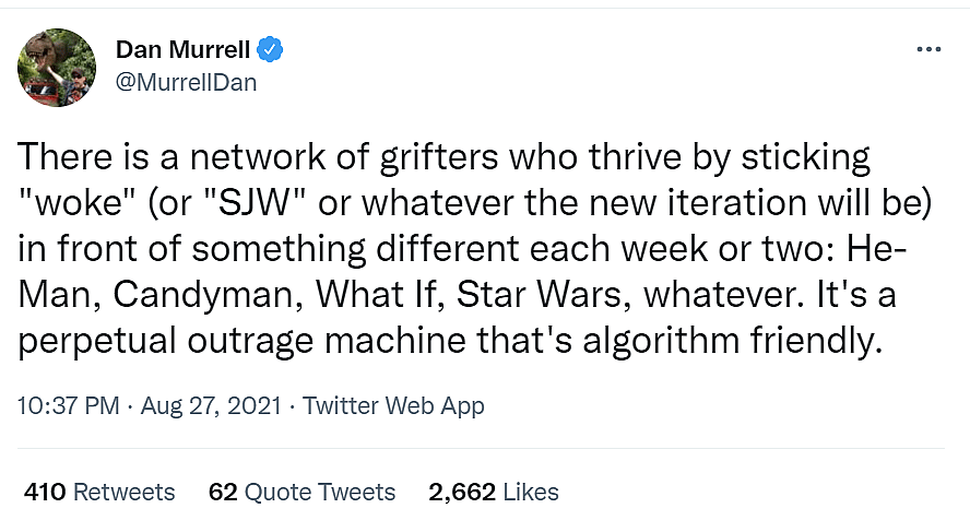 Murrell posted to Twitter, “There is a network of grifters who thrive by sticking ‘woke’ (or ‘SJW’ or whatever the new iteration will be) in front of something different each week or two: He-Man, Candyman, What If, Star Wars, whatever. It’s a perpetual outrage machine that’s algorithm friendly.”