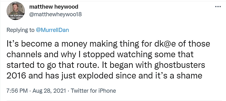 Matthewheywoo18 tweeted, “It’s become a money making thing for dk@e of those channels and why I stopped watching some that started to go that route. It began with ghostbusters 2016 and has just exploded since and it’s a shame.”