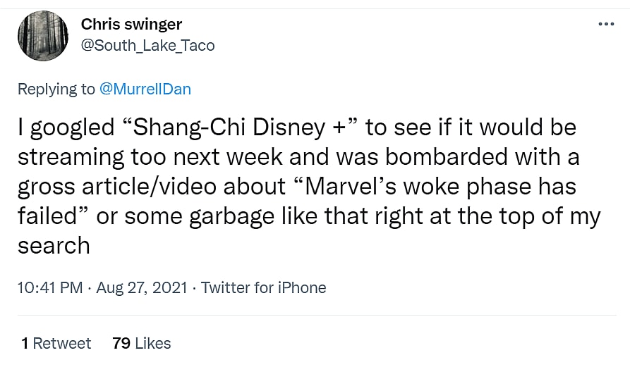 South_Lake_Taco tweeted, “I google ‘Shang-Chi Disney +’ to see if it would be streaming too next week and was bombarded with a gross article/video about ‘Marvel’s woke phase has failed’ or some garbage like that right at the top of my search.”