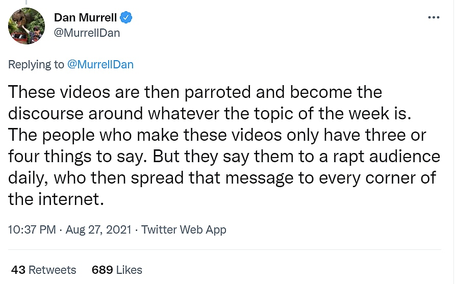 He continued, “These videos are then parroted and become the discourse around whatever the topic of the week is. The people who make these videos only have three or four things to say. But they say them to a rapt audience daily, who then spread that message to every corner of the internet.”