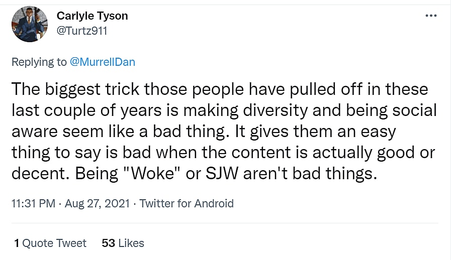 Turtz911 tweets, “The biggest trick those people have pulled off in these last couple of years is making diversity and being social aware seem like a bad thing. It gives them an easy thing to say is bad when the content is actually good or decent. Being ‘Woke’ or SJW aren’t bad things.”