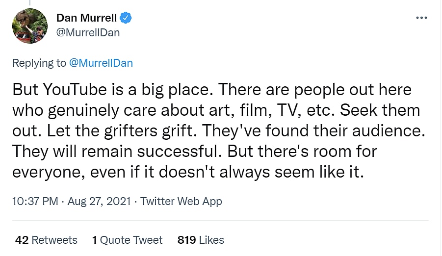 He finally concluded the thread, “But YouTube is a big place. There are people out here who genuinely care about art, film, TV, etc. Seek them out. Let the grifters grift. They’ve found their audience. They will remain successful. But there’s room for everyone, even if it doesn’t always seem like it.”