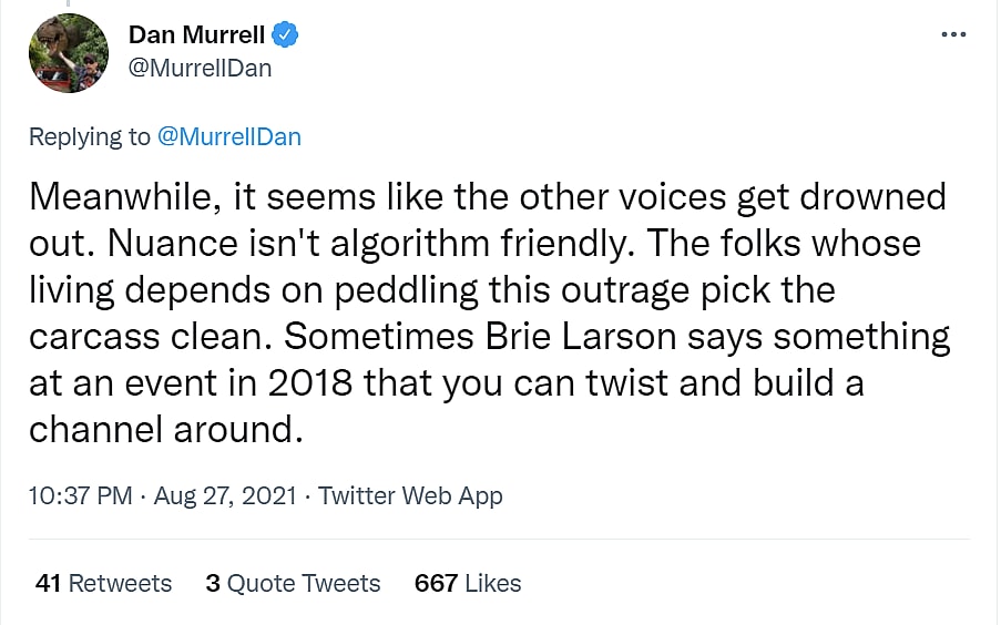 “Meanwhile, it seems like the other voices get drowned out. Nuance isn’t algorithm friendly. The folks whose living depends on peddling this outrage pick the carcass clean. Sometimes Brie Larson says something at an event in 2018 that you can twist and build a channel around,” he went on.
