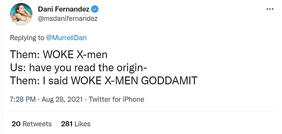 Best of Battlecam writer Dani Fernandez tweeted, “Them: WOKE X-men Us: have you read the origin- Them: I said WOKE X-MEN GODDAMIT”