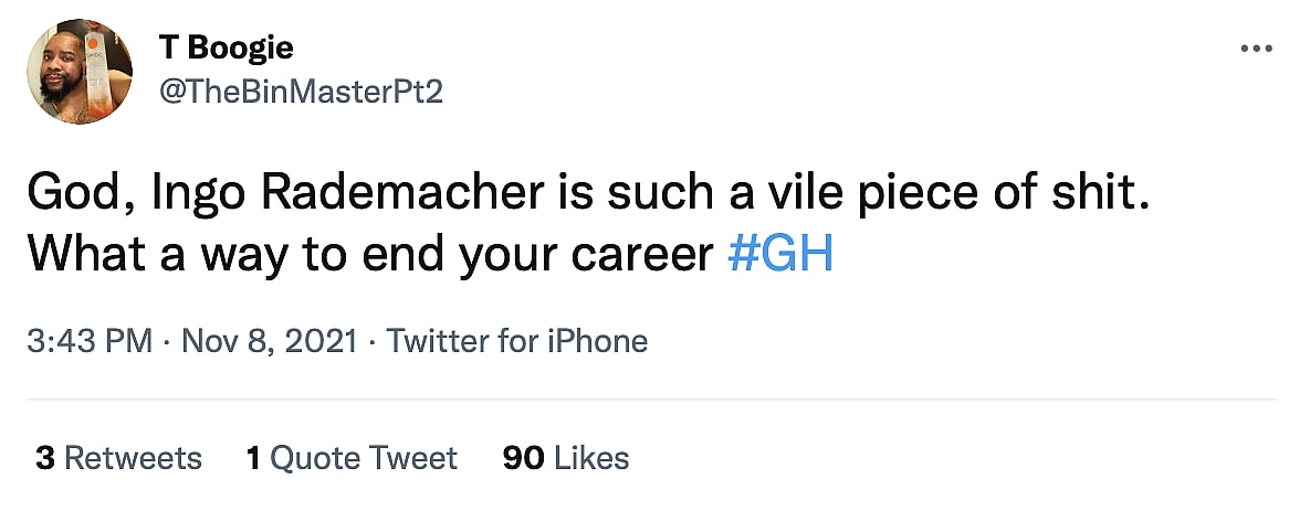 “God, Ingo Rademacher is such a vile piece of s—t. What a way to end your career #GH” read a separate tweet from @TheBinMasterPt2.