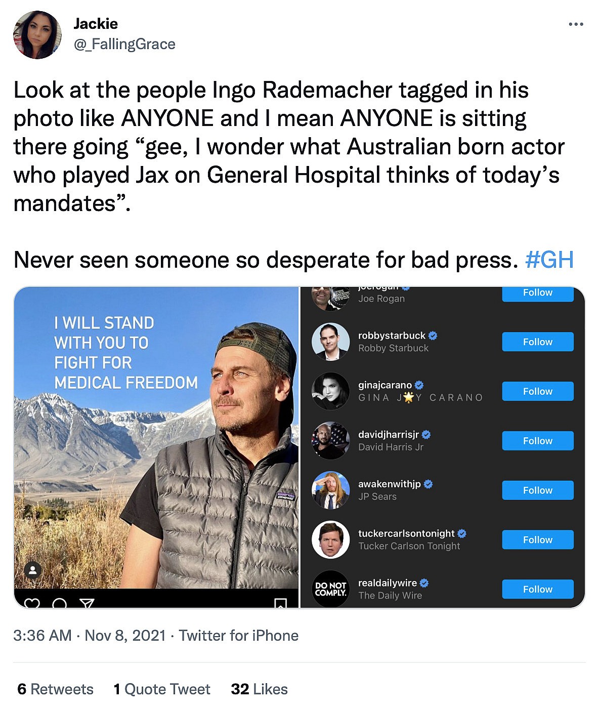 Judging who Rademacher follows on Instagram, Twitter user @_FallingGrace pointed out, “Look at the people Ingo Rademacher tagged in his photo like ANYONE and I mean ANYONE is sitting there going ‘gee, I wonder what Australian born actor who played Jax on General Hospital thinks of today’s mandates.'”