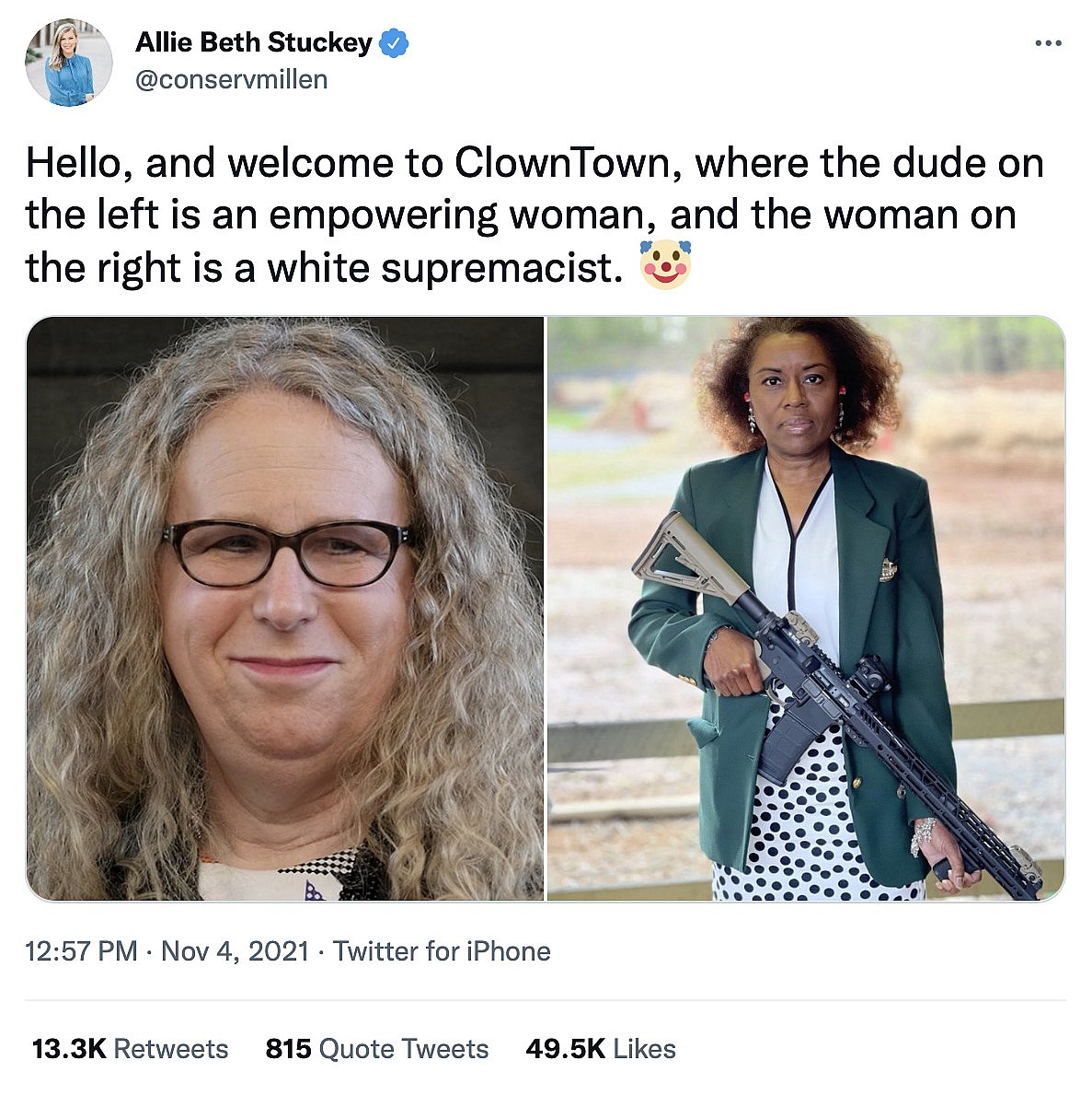 In response to Levine’s appointment, conservative commentator Allie Beth Stuckey wrote on Twitter, “Hello, and welcome to ClownTown, where the dude on the left is an empowering woman, and the woman on the right is a white supremacist.”