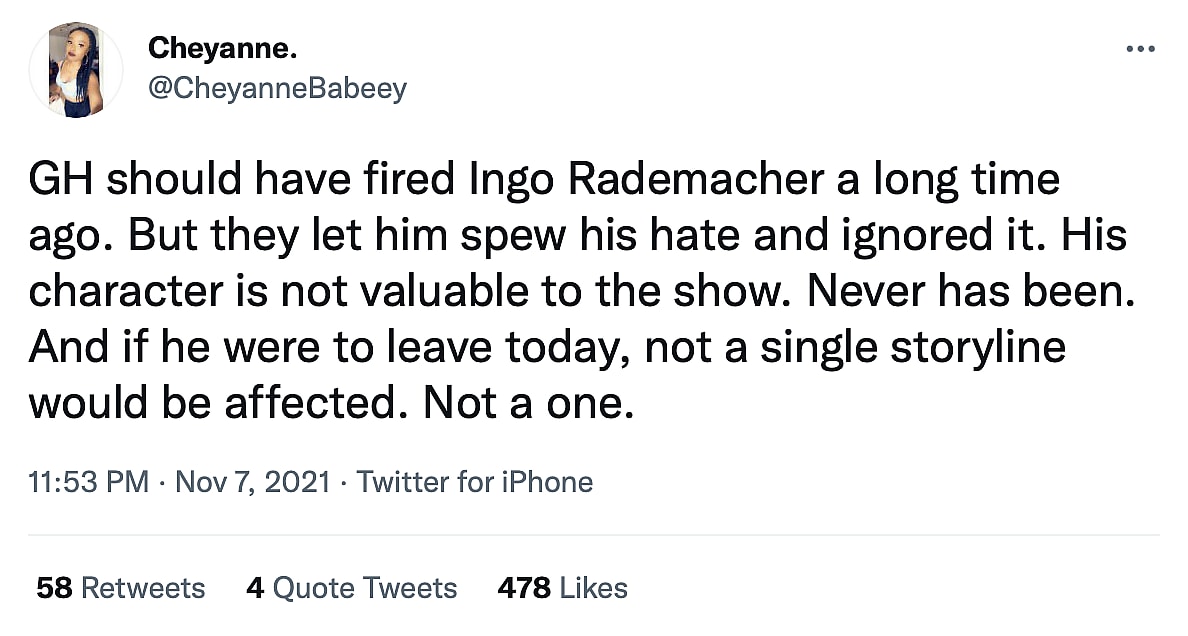 @CheyanneBabeey asserted, “[General Hospital] should have fired Ingo Rademacher a long time ago. But they let him spew his hate and ignored it. His character is not valuable to the show. Never has been. And if he were to leave today, not a single storyline would be affected. Not one. ”