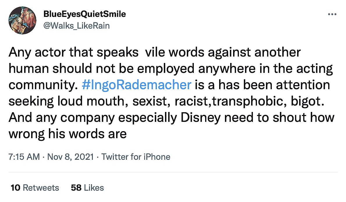 “Any actor that speaks vile words against another human should not be employed anywhere in the acting community,” read a tweet from @Walks_LikeRain. “#IngoRademacher is a has been attention seeking loud mouth, sexist, racist, transphobic, bigot. And any company especially Disney need to shout how wrong his words are.”