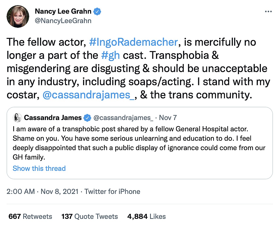 General Hospital actress Nancy Lee Graham chimed in writing, “The fellow actor, #IngoRademacher, is mercifully no longer a part of the #gh cast. Transphobia & misgendering are disgusting & should be unacceptable in any industry, including soaps/acting. I stand with my costar, @cassandrajames_, & the trans community.”