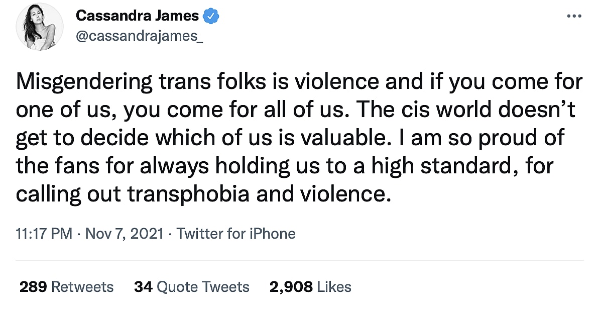 In a follow-up tweet, James asserted, “Misgendering trans folks is violence and if you come for one of us, you come for all of us. The cis world doesn’t get to decide which of us is valuable. I am so proud of the fans for always holding us to a high standard, for calling out transphobia and violence.”