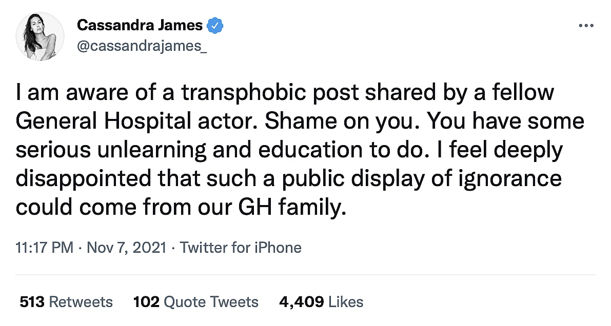 “I am aware of a transphobic post shared by a fellow General Hospital actor. Shame on you,” wrote transgender General Hospital actress Cassandra James, adding, “You have some serious unlearning and education to do.”