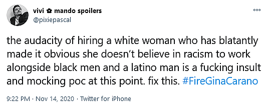 @Pixiepascal took issue with what they believed to be “the audacity of hiring a white woman who has blatantly made it obvious she doesn’t believe in racism to work alongside black men and a latino man”, declaring Carano’s continued employment to be a “f—ing insult and mocking poc.”