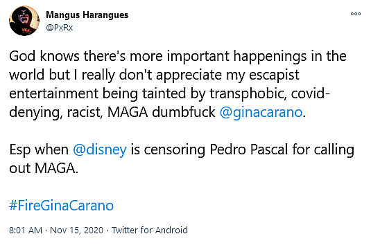 “I really don’t appreciate my escapist entertainment being tainted by a transphobic, covid-denying, racist, MAGA dumbf—,” said @PxRx. “Esp when @Disney is censoring Pedro Pascal for calling out MAGA.”