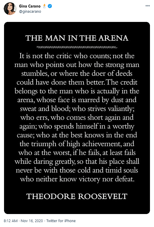 As the backlash continued to mount against Carano, the Cara Dune actress shared the ‘The Man in the Arena’ passage from former President Theodore Roosevelt’s ‘Citizenship in a Republic’ speech, which asserts that “it is not the critic who counts”, but rather that “the credit belongs to the man who is actually in the arena.”