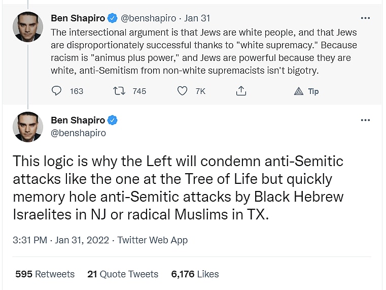 He elaborated in a short thread stating, “The intersectional argument is that Jews are white people , and that Jews are disproportionately successful thanks to “white supremacy.” Because racism is “animus plus power,” and Jews are powerful because they are white, anti-Semitism from non-white supremacists isn’t bigotry.”