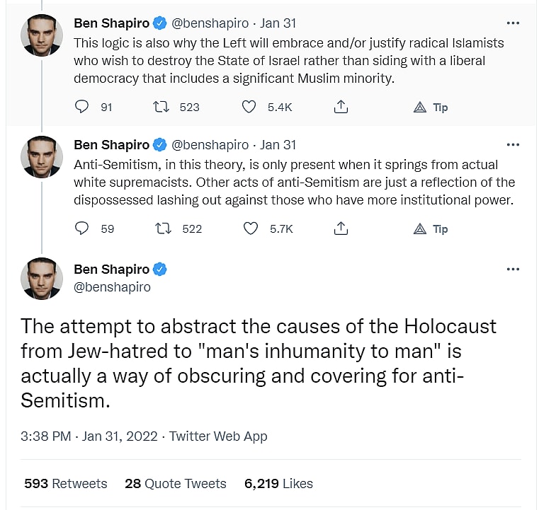 “Anti-Semitism, in this theory, is only present when it springs from actual white supremacists,” Shapiro explained. “Other acts of anti-Semitism are just a reflection of the dispossessed lashing out against those who have more institutional power.”