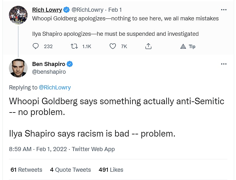 He would also describe her comments as “anti-Semitic in response to National Review Editor Rich Lowry writing, “Whoopi Whoopi Goldberg says something actually anti-Semitic — no problem. Ilya Shapiro says racism is bad — problem.”