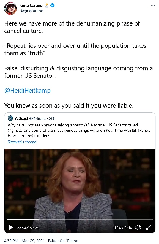During a March 19th, 2021 appearance on Real Time with Bill Maher, in response to the eponymous host inquiring about why Carano was so unceremoniously cancelled and fired, Heitkamp asserted that “She was a Nazi” and “She’s involved in White Supremacy.”
