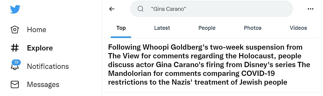 Twitter wrote, “Following Whoopi Goldberg’s two-week suspension from The View for comments regarding the Holocaust, people discuss actor Gina Carano’s firing from Disney’s series The Mandalorian for comments comparing COVID-19 restrictions to the Nazis’ treatment of Jewish people.”