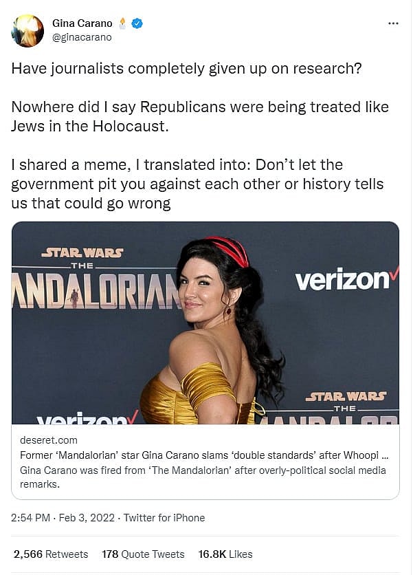 Carano would rebuke these lies, and specifically Deseret News’ lie, when she wrote on Twitter, “Have journalists completely given up on research? Nowhere did I say Republicans were being treated like Jews in the Holocaust.”