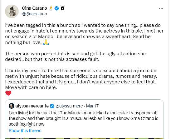 In response to Mercante, Carano tweeted, “I’ve been tagged in this a bunch so I wanted to say one thing.. please do not engage in hateful comments towards the actress in this pic. I met her on season 2 of Mando I believe and she was a sweetheart. Send her nothing but love.”