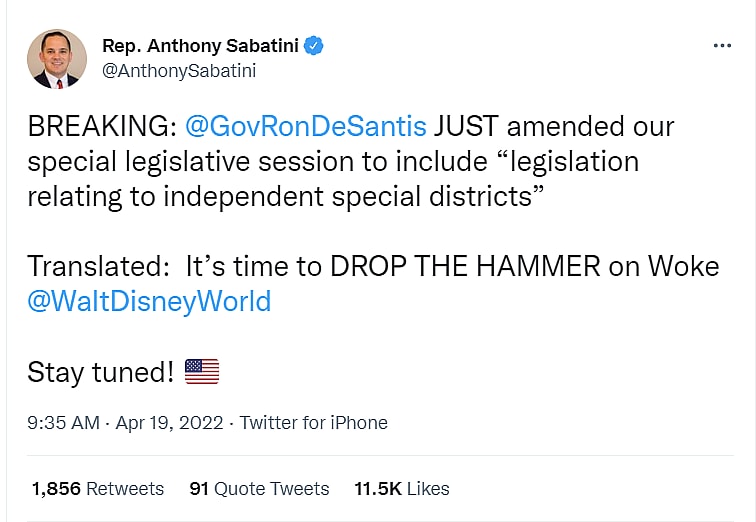 Following DeSantis’ announcement Florida state representative Anthony Sabatini tweeted, “BREAKING: Governor Ron DeSantis JUST amended our special legislative session to include ‘legislation relating to independent special districts.”