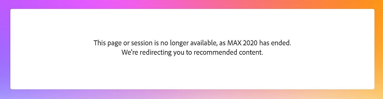 When attempting to access the website, users are now encountered with this message, “This page or session is no longer available, as MAX 2020 has ended. We’re redirecting you to recommended content.”