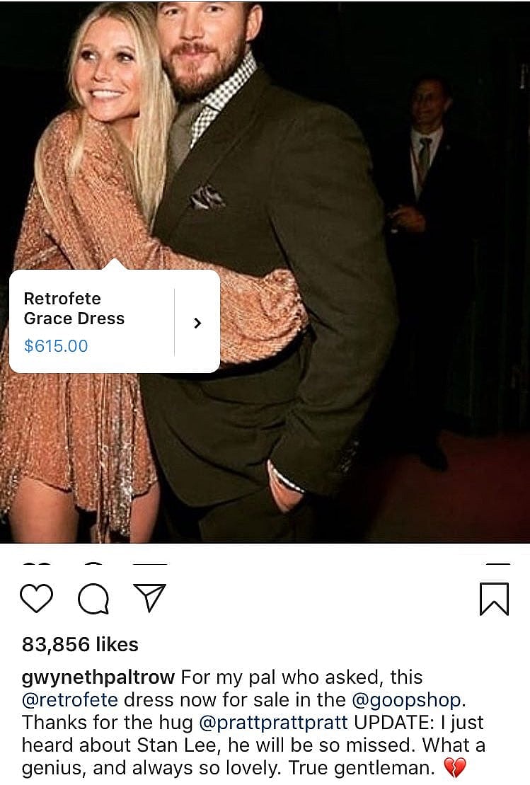 It gets worse, Paltrow’s “tribute” to Stan Lee appeared to be more of an afterthought as she drew attention to the photo by indicating the dress was for sale in her Goop shop.