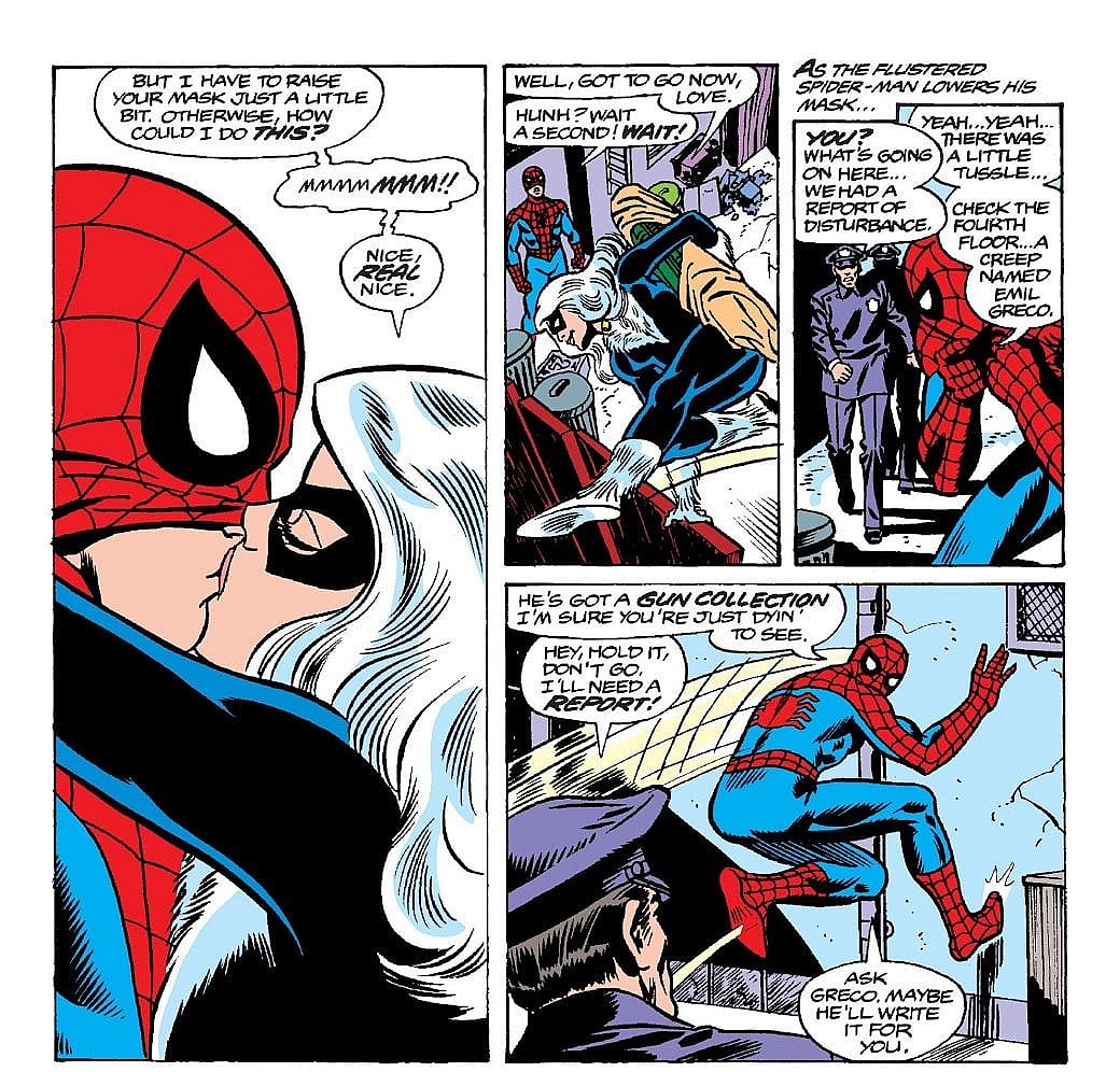 It works as Black Cat gives Spider-Man a big kiss and leaves him stunned as she gets away with the weapons she purchased from Greco.