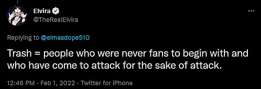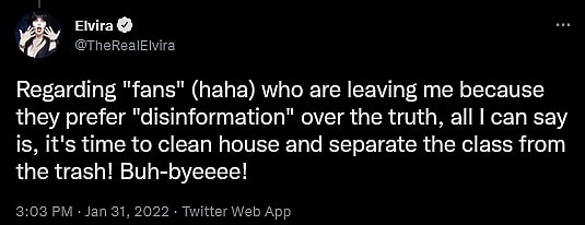 Amidst further pushback from her fans, Peterson’s rhetoric then took an even more insulting turn, as the B-movie connoisseur proceeded to declare in a follow-up to her original tweet, “Regarding ‘fans’ (haha) who are leaving me because they prefer ‘disinformation’ over the truth, all I can say is, it’s time to clean house and separate the class from the trash! Buh-byeeee!”