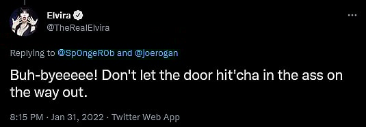 The horror hostess then continued to engage with her fans, doubling down on her stance that Rogan’s podcast was physically dangerous and further insulting those who found themselves at odds with her censorious wishes.
