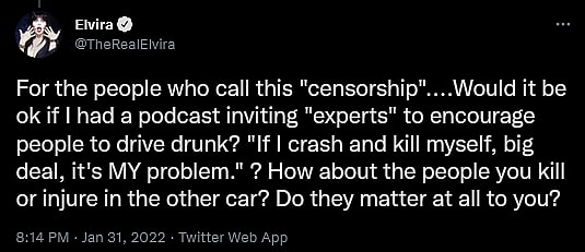 “For the people who call this ‘censorship’….Would it be ok if I had a podcast inviting ‘experts’ to encourage people to drive drunk?” she further argued, falsely equating the advocation of an illegal act with the discussion of, at worst, fringe opinions on emerging medical news. “‘If I crash and kill myself, big deal, it’s MY problem.’? How about the people you kill or injure in the other car? Do they matter at all to you?”