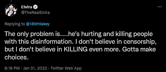 “The only problem is….he’s hurting and killing people with this disinformation,” she fired back. “I don’t believe in censorship, but I don’t believe in KILLING even more. Gotta make choices.”