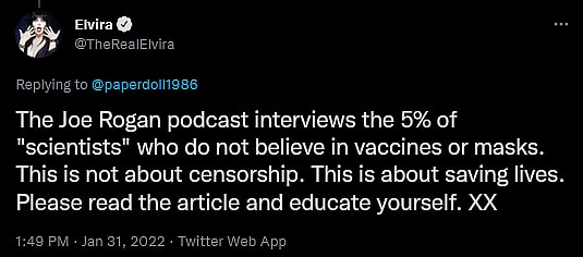 In explanation of her position to one such fan (whose initial tweet has since been deleted), Peterson asserted, “The Joe Rogan podcast interviews the 5% of ‘scientists’ who do not believe in vaccines or masks. This is not about censorship. This is about saving lives. Please read the article and educate yourself. XX.”