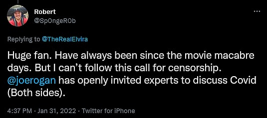 “Huge fan. Have always been since the movie macabre days. But I can’t follow this call for censorship,” lamented @Sp0ngeR0b. “@joerogan has openly invited experts to discuss Covid (Both sides).”