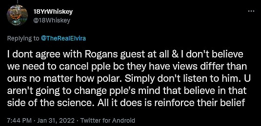 Despite finding themselves opposed to the viewpoints espoused on Rogan’s podcast, @18Whiskey reasoned to Peterson, “I don’t agree with Rogans guest at all & I don’t believe we need to cancel people bc they have views different than ours, no matter how polar. Simply don’t listen to him. U aren’t going to change people’s mind that believe in that side of the science. All it does is reinforce their belief.”