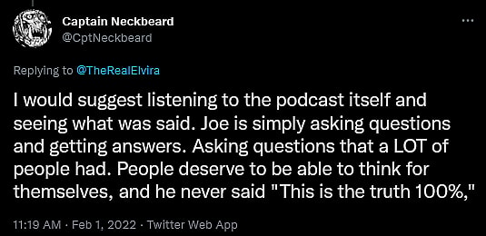 When another user suggested “listening to the podcast itself and seeing what was said” in response, noting that Rogan was merely “asking questions that a LOT of people had,” Peterson exclaimed, “I HAVE!”