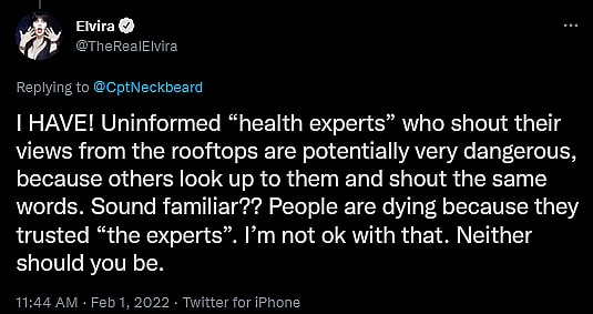 “Uninformed ‘health experts’” who shout their views from the rooftops are potentially very dangerous, because others look up to them and shout the same words. Sound familiar??” she stated. “People are dying because they trusted ‘the experts’. I’m not ok with that. Neither should you be.”