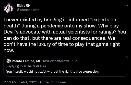 Replying to @WBottomfellows, who pointed out how Peterson’s career “literally would not exist without the right to free expression,” the Mistress of the Dark retorted, “I never existed by bringing ill-informed ‘experts on health’ during a pandemic onto my show.”