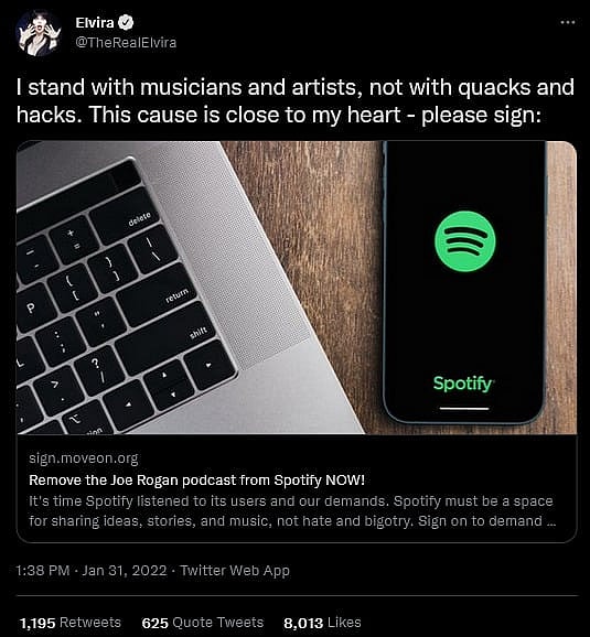 She then proceeded to ask her followers to sign a moveon.org petition calling on the powers that be to “Remove the Joe Rogan podcast from Spotify NOW!”, telling them, “This cause is close to my heart.”