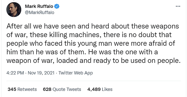 Marvel Studios Hulk actor Mark Ruffalo took to Twitter to mourn two of Kyle Rittenhouse assailants following the announcement that Rittenhouse was found not guilty by a jury of his peers.