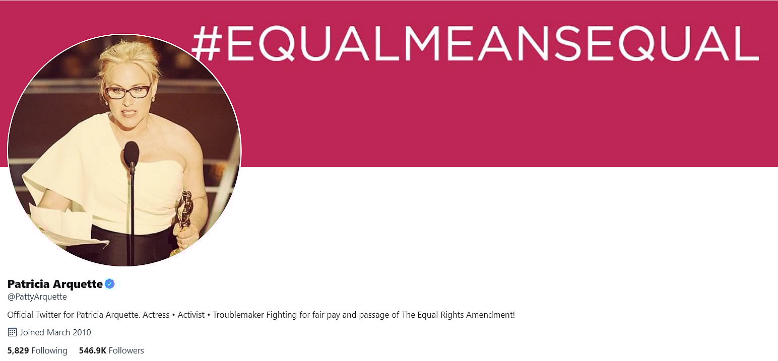 It reads, “Official Twitter for Patricia Arquette Actress • Activist • Troublemaker Fighting for fair pay and passage of The Equal Rights Amendment!”