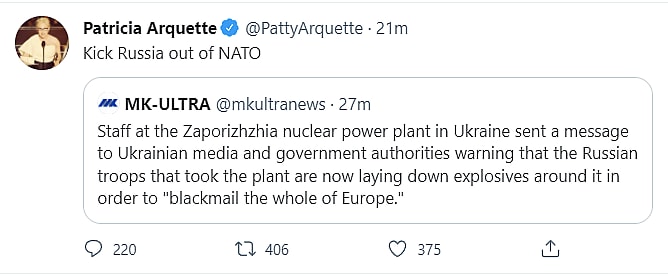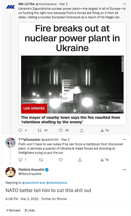 In a now-deleted tweet, Arquette responded to a Twitter post from MK-Ultra News that read, “Staff at the Zaporizhzhia nuclear power plant in Ukraine sent a message to Ukrainian media and government authorities warning that the Russian troops that took the plant are now laying down explosives around it in order to ‘blackmail the whole of Europe.'”