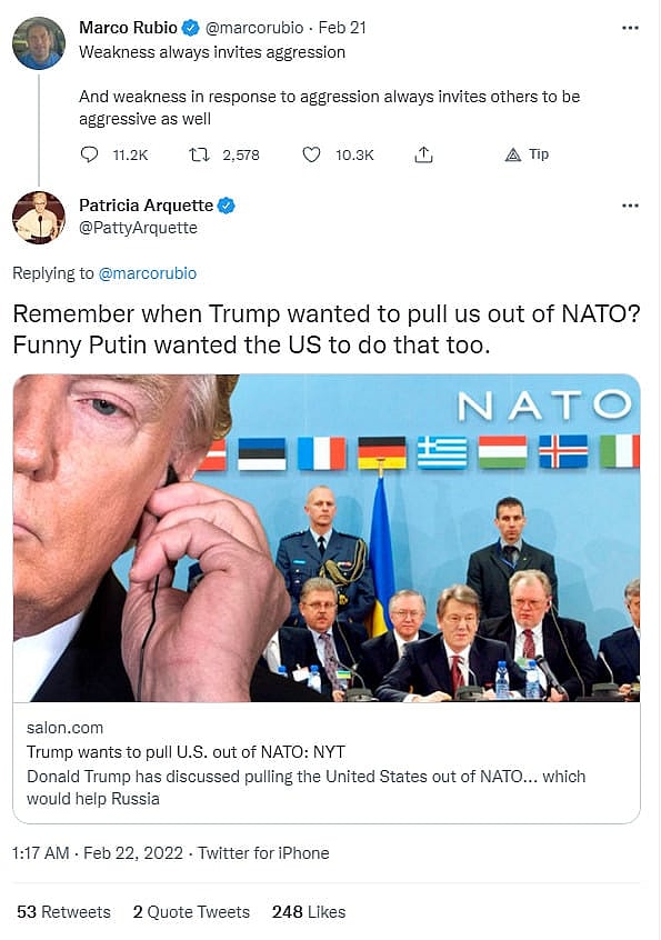 And then on February 22nd she wrote, “Remember when Trump wanted to pull us out of NATO? Funny Putin wanted the US to do that too.”