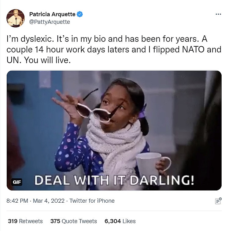 Arquette would double down on the idea that it was her dyslexia that caused her to write NATO instead of UN in a tweet response to Jim Swift.