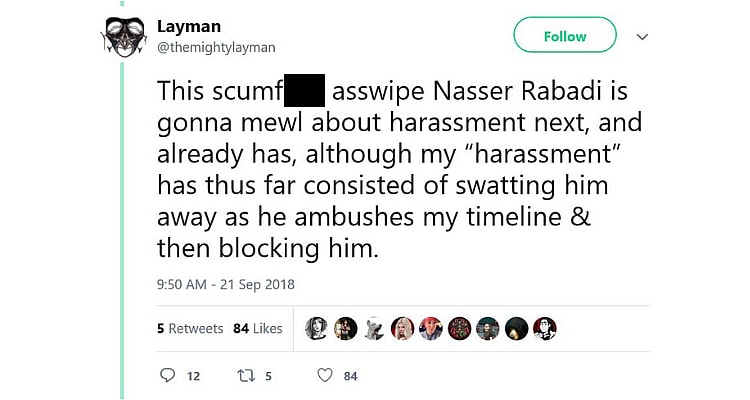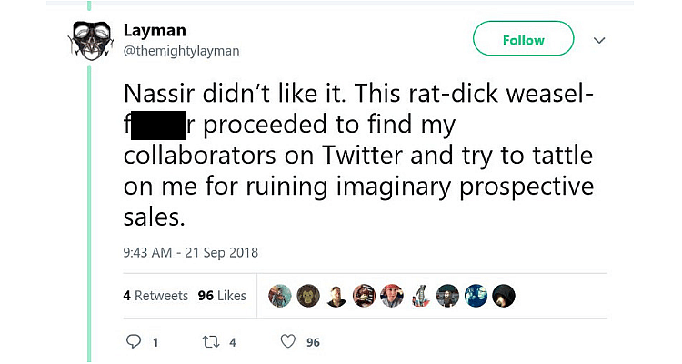 However, according to a search of both Nasser and Layman’s feeds and their tagged interactions with each other, this never happened. In fact, Nasser’s first interaction with Layman was earlier this year, where Nasser tells Layman that he had desired to pick up Chew, but expressed disappointment that Layman would alienate fans. Layman met this tweet, and the subsequent tweets from Nasser explaining his rationale and attempting to engage in discussion, with insults. Some of these interactions include: