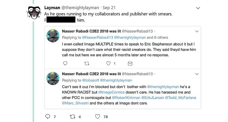 Twitter searches also reveal that, until the recent rant by Layman, he and Nasser had a limited amount of interactions. After the May 20th back-and-forth, Nasser and Layman never directly interacted until the recent rant, aside from being tagged in various Comicsgate-related discourses. However, this does not imply they were actively engaging each other, but rather that their accounts were tagged by others to raise the visibility of a respective discussion.