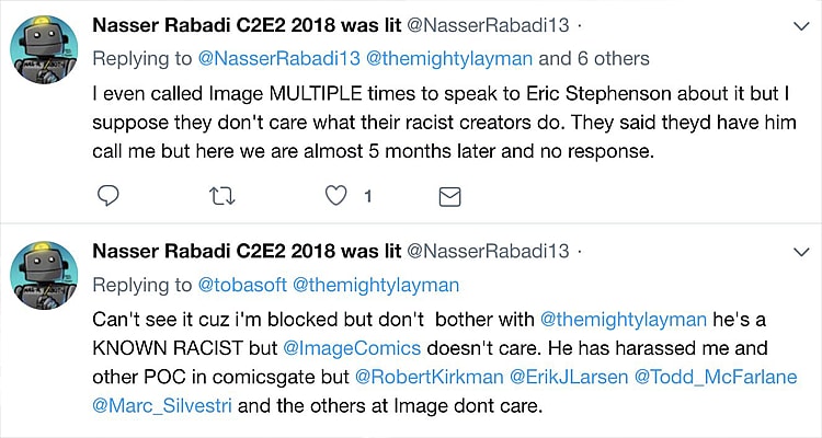 Now it turns out this human cum rag Nassir Rabadi, this walking unflushed truck stop toilet, has invented that I’m racist for not putting up with his shit, not kissing his stupid Comicsgate ass. And has been making REPEATED calls to Image to what… accuse me of racism? pic.twitter.com/nT5nwWXch4