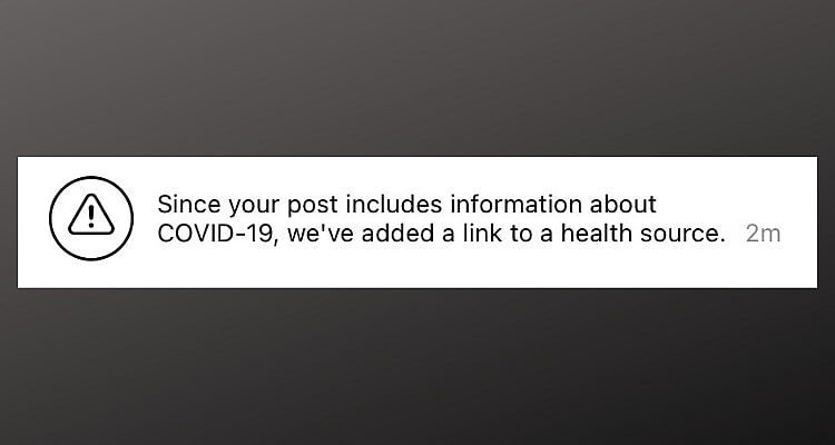 The picture shows an alert stating “Since your post includes information about COVID-19, we’ve added a link to a health source.”